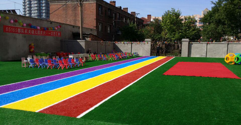 幼儿园专用人造草坪以专用设计、使用成本少、维护保养方便、环保安全、外形美观、适应性强等优势,全面覆盖和替代了传统塑胶和PVC等铺装材料。相对于普通人造草坪,它对幼儿园有更强的针对性和更好的适应性。